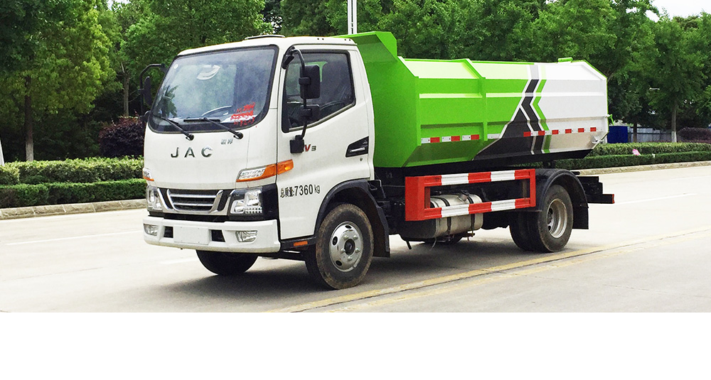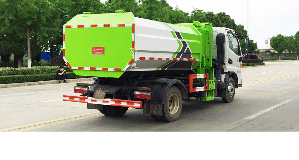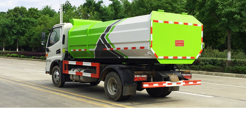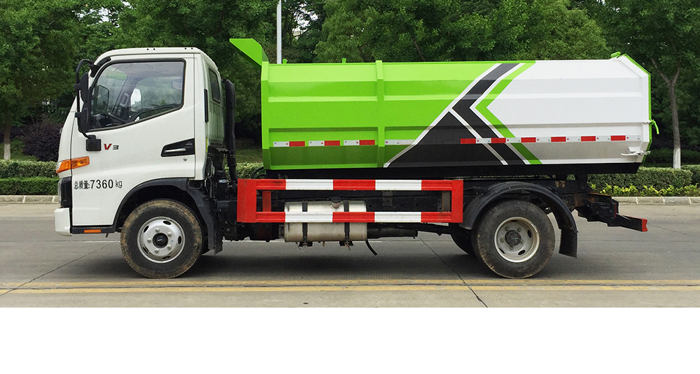 一车多配,能与多个垃圾桶联合作业,循环运输,连杆上料机构具有结构简单、性能可靠、上料循环时间短、运行效率高等优点;垃圾箱上侧设有挡板、翻桶架,投料口独特设计,可防止上料时垃圾漏洒。