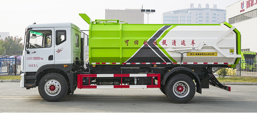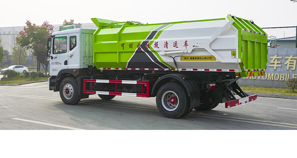 一车多配,能与多个垃圾桶联合作业,循环运输,连杆上料机构具有结构简单、性能可靠、上料循环时间短、运行效率高等优点;垃圾箱上侧设有挡板、翻桶架,投料口独特设计,可防止上料时垃圾漏洒。