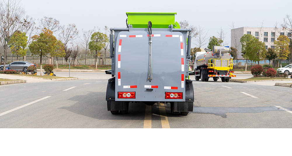垃圾箱底部设置大量过滤孔,实现箱内餐厨垃圾固液的初步分离,装载能力强并配备有大容量污水箱;配套波压驱动高压清洗系统,可对整车及工作装置进行清洗。