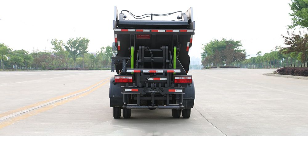采用后装刮板压缩技术,对生活垃圾大幅度压缩减容;压缩比可达1:1.5以上,生活垃圾经压缩后可达到500~700Kg/m3以上