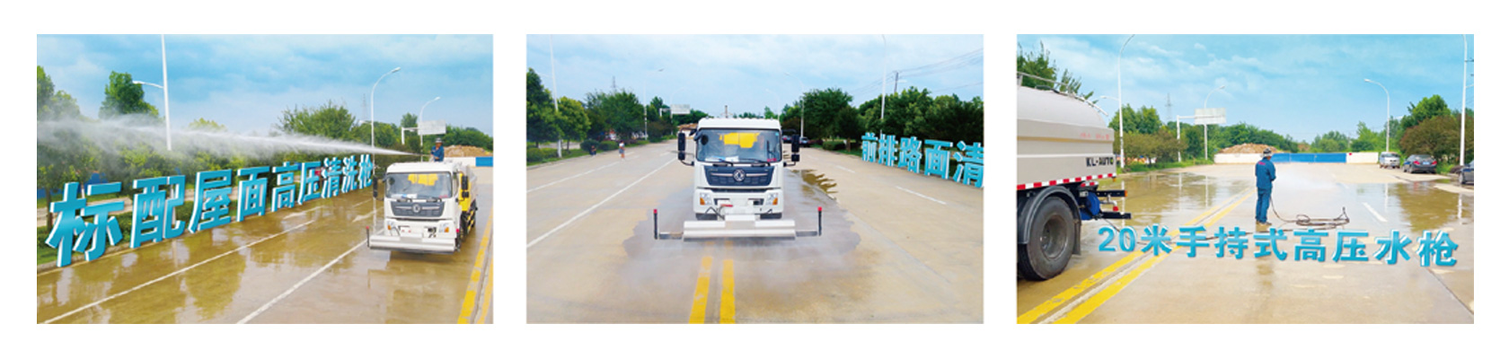 具有独立的高、低两套水路系统,高压系统采用进口高压水泵,清洗效果好、用水量小,以高压力、低流量的方式清洗路面脏污,高效省水。低压系统具有路面洒水、降温、除尘、冲洗尘埃污物、路面养护、园林浇灌及应急消防等功能。
