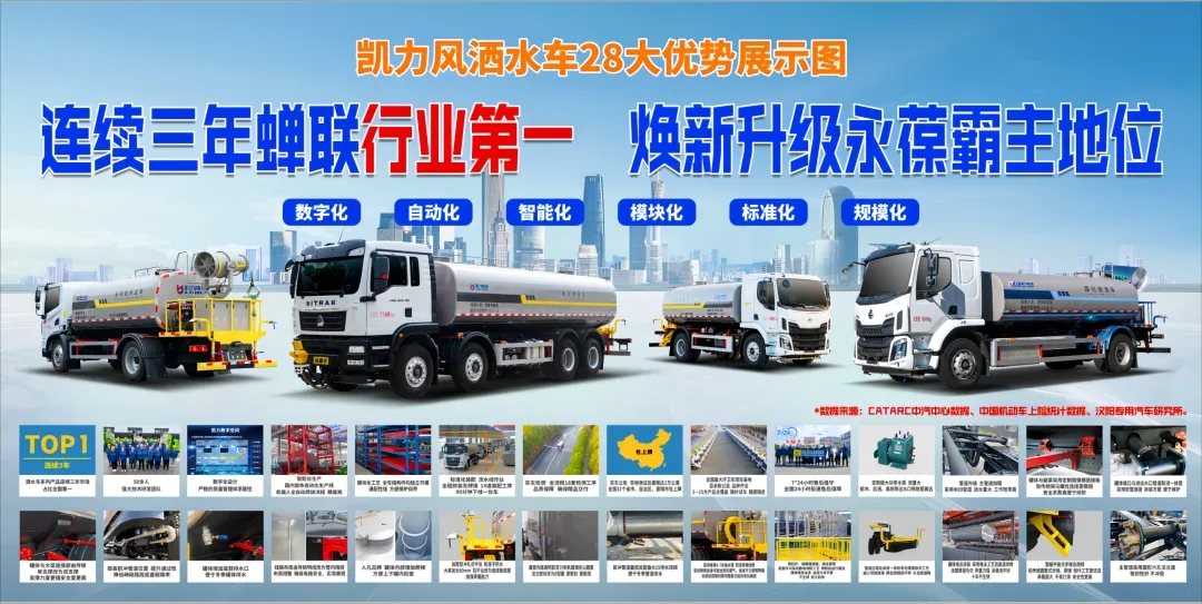 凯力风东风华神KL5洒水车是湖北凯力专用汽车有限公司自主研发设计的第 4 代环卫装备,性能达世界领先水平,年产销超10000台。标配前冲、后洒、侧喷等,还可选装高压水炮、消防接口等,适用于多种场景,具有多种功能。凯力风洒水车已连续三年荣膺全国销量第一名。