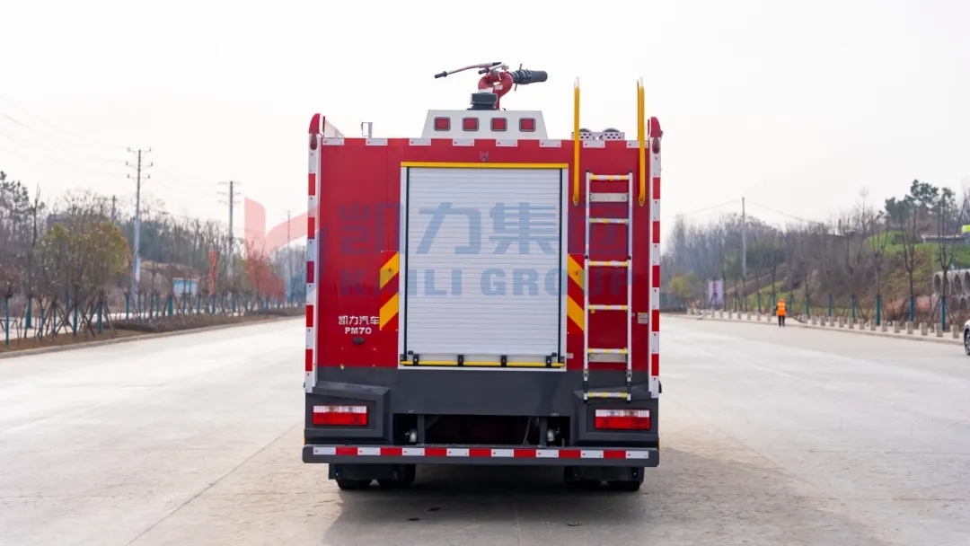 操控设计上,驾驶室采用平头四开门双排结构,前排3人+后排3人的座位布局,满足6人战斗编组同步出征。100W警报器、取力器控制开关等设备集中布置在驾驶区,伸手可及;夹心式全功率取力器通过电磁阀控制,响应时间≤0.5 秒,配合强制水冷系统,即使连续工作也能稳定输出动力。电器系统更是“救援天眼”,1.9米长排LED警灯在远处可见,后顶部360°LED遥控探照灯可穿透浓烟锁定火源,两侧3组爆闪灯+侧照明灯,让夜间救援如同白昼。
