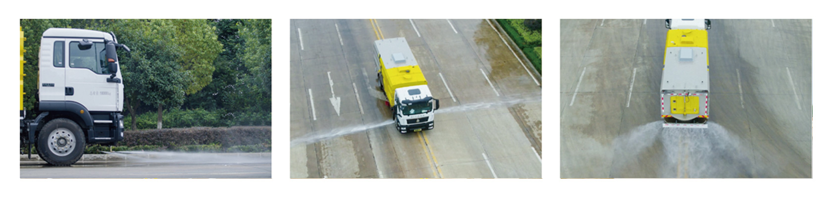 具有路面洒水、冲洗、扫路、清洗、降尘等多种功能。同时配有高压水枪可对道路卫生死角、牛皮癣及车辆自身进行清洁作业采用“中置两扫盘+中置宽吸嘴+内置高压主喷杆+左右高压侧喷杆”布置,小流量高压水泵,左右喷杆V形布置和吸嘴内置主喷杆无间隙高压喷嘴喷水,洗净率高、作业速度快。