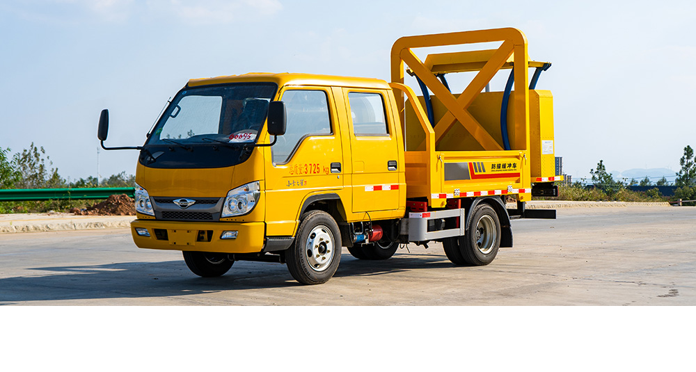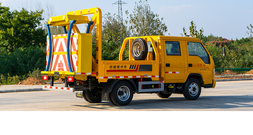 防撞缓冲垫具有两级吸能功效,金属弧形弯管结构在碰撞发生时,弧形管先期吸收巨大的初始碰撞能量,当碰撞能量造成弧形弯管变形后,充满缓冲材料的结构进入变形吸能状态。在碰撞过程中,防撞缓冲垫所有吸能材料和变形部件均被有效包裹在防撞缓冲垫内,不允许任何材料飞溅到其他相邻车道。缓冲垫工作及行驶过程中均具备同步灯光系统(转向灯、刹车灯、驻车灯,条形爆闪灯等)。