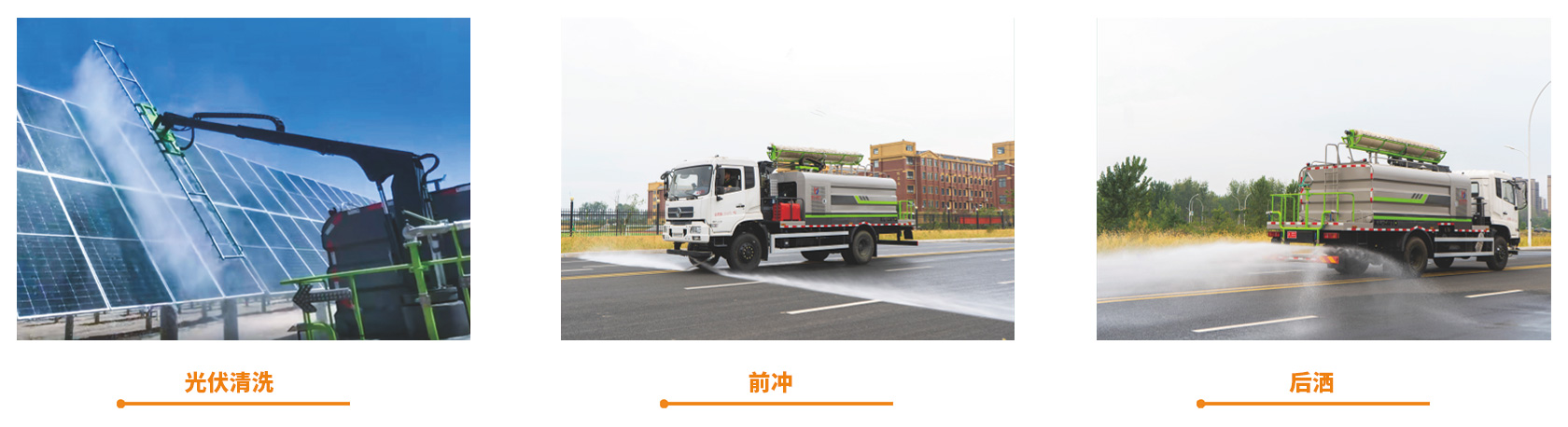 独立的高、低压水路系统。高压水路系统主要负责为清洗系统提供高压水,低压水路系统主要负责为常规酒水提供水源,具体包括前冲、后酒、侧喷及绿化炮。尾部安装大工作平台,可加装雾炮装置,实现一车多用,最大程度保证车辆的利用率。